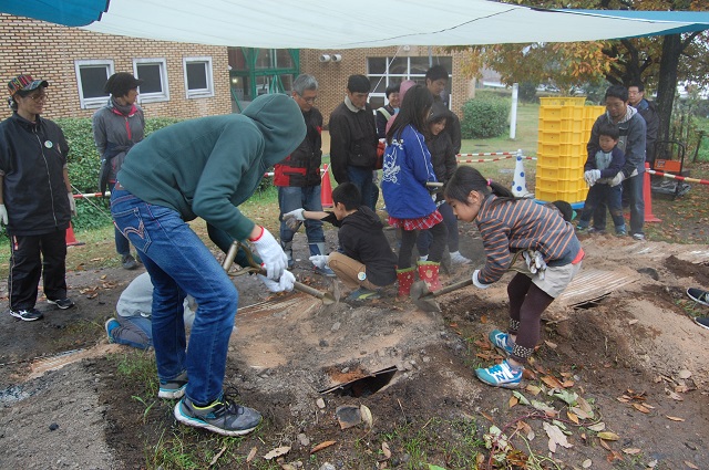 窯にかぶせてある土、トタンなどをとりのぞきます。
