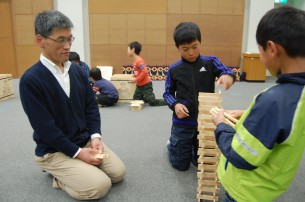 どのチームもお父さん同士で相談し、積みかたを工夫してより高いタワーを目指します。