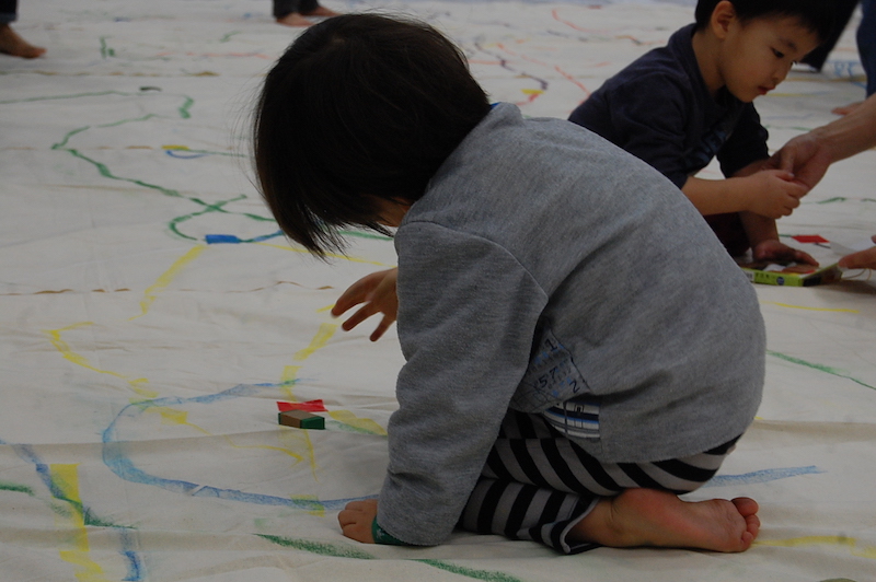 「しれい」に従って色の点をつなげて、全身を使って「線」を描きます。