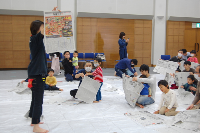 さあ次はいよいよ大きなものに挑戦。新聞紙をテープでつなぎ合わせます。