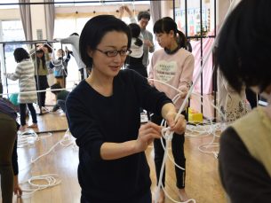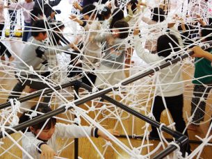 パイプの枠に発泡ウレタン製のひもを結んでいき、みんなで不思議な空間をつくるあそびです。