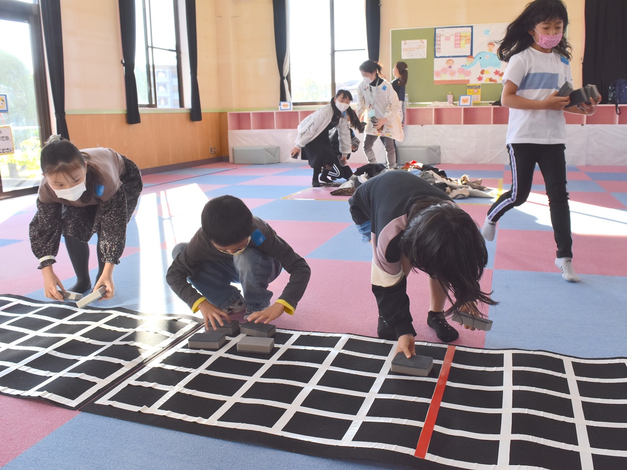1分以内に隠したり見つけたり…布や新聞など、隠す場所や物が違うと勝手が違いますが、どうしたらたくさん運べるか???作戦を立てているチームもありました。探しきれなかったものは、全員で無事に探し出すことができました!