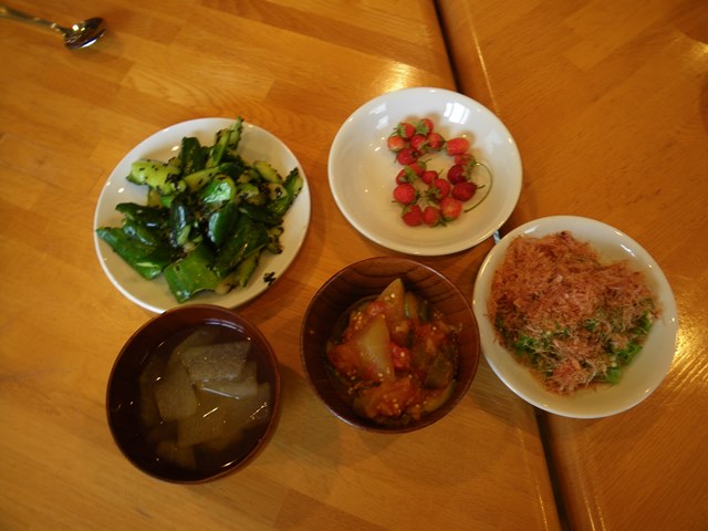 ズッキーニとピーマンはメンバーが持ってきてくれた冬瓜となすといっしょにトマト缶で煮て、