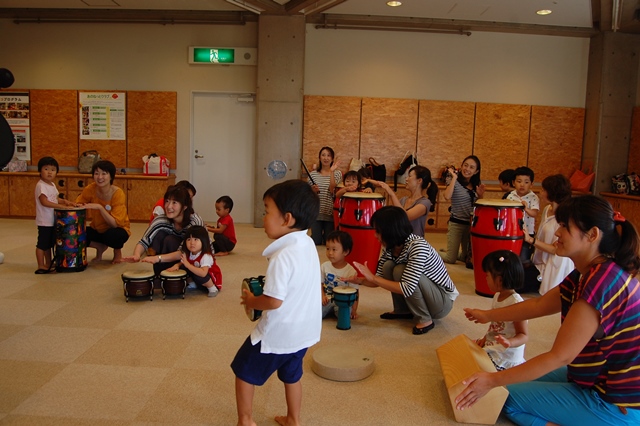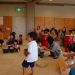 たたいて音を出すタイプのいろいろな音具を使って、みんなで遊びました。