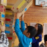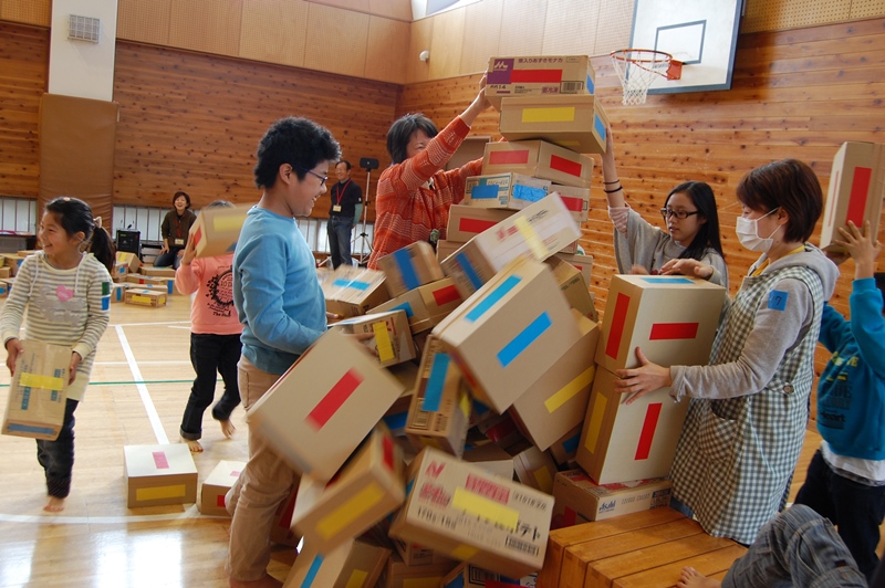 ダンボールをひたすら高く積んでいくゲームでは、3チームとも崩れる崩れる!
