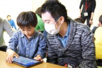 タブレット端末を使ってのプログラミングにお父さんと子ども達は夢中です。