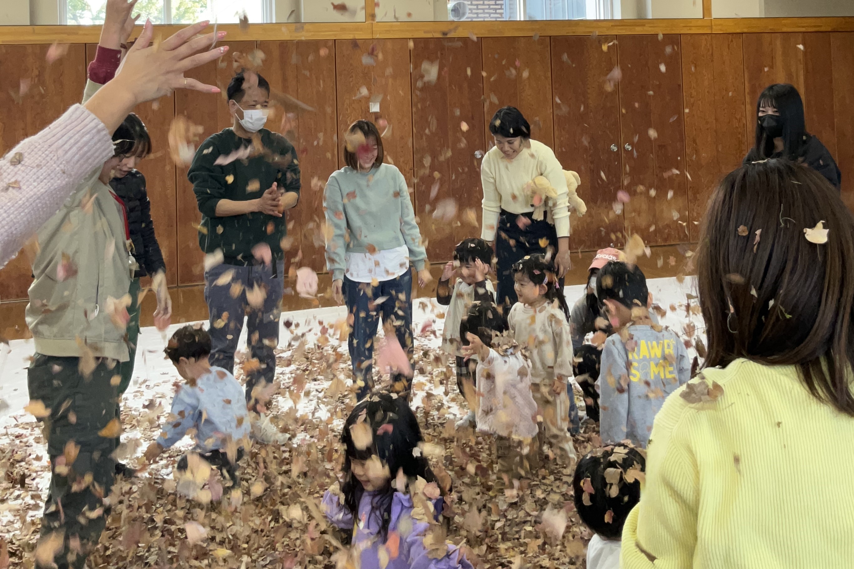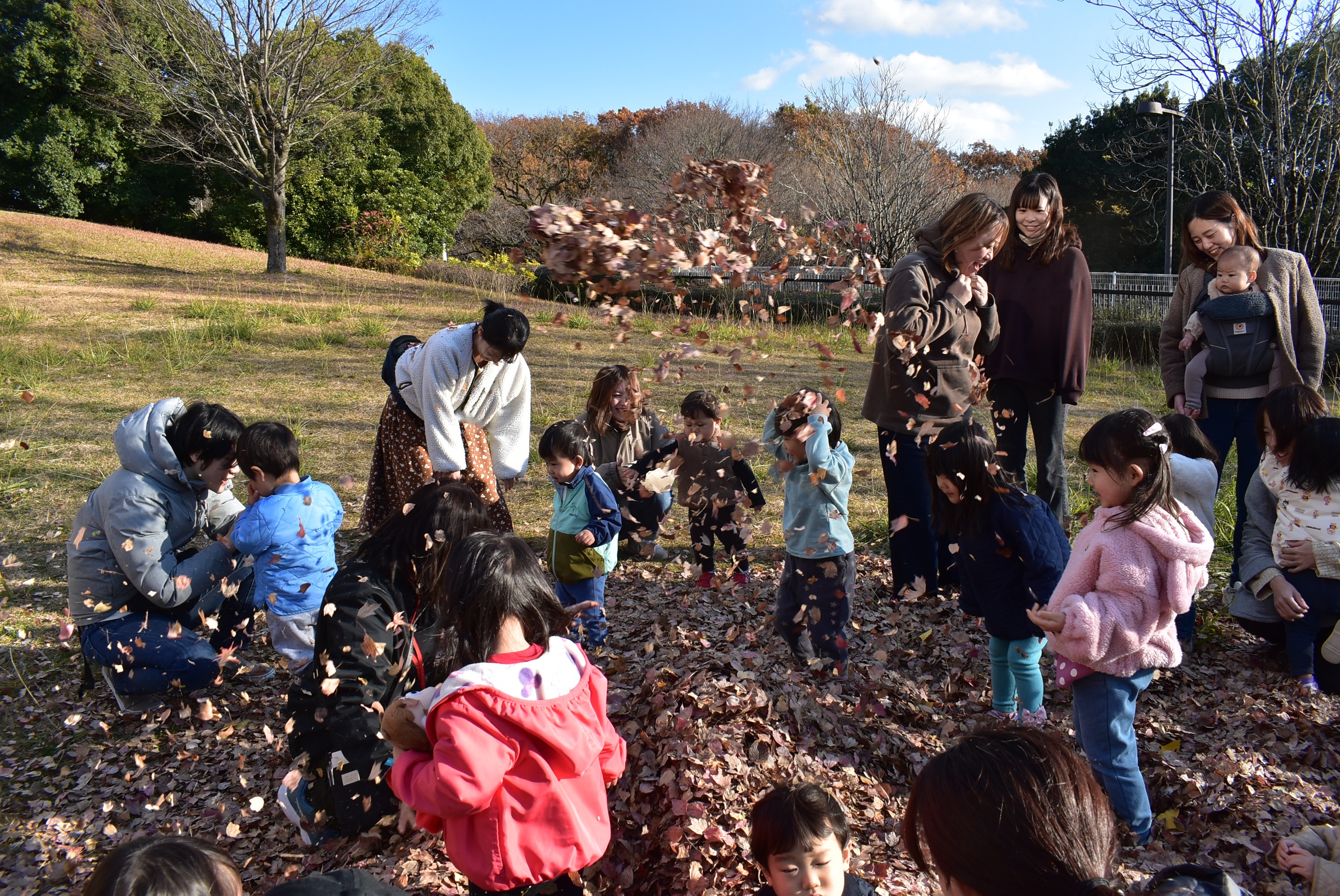 落ち葉の温かさや感触など五感をつかって遊びます。