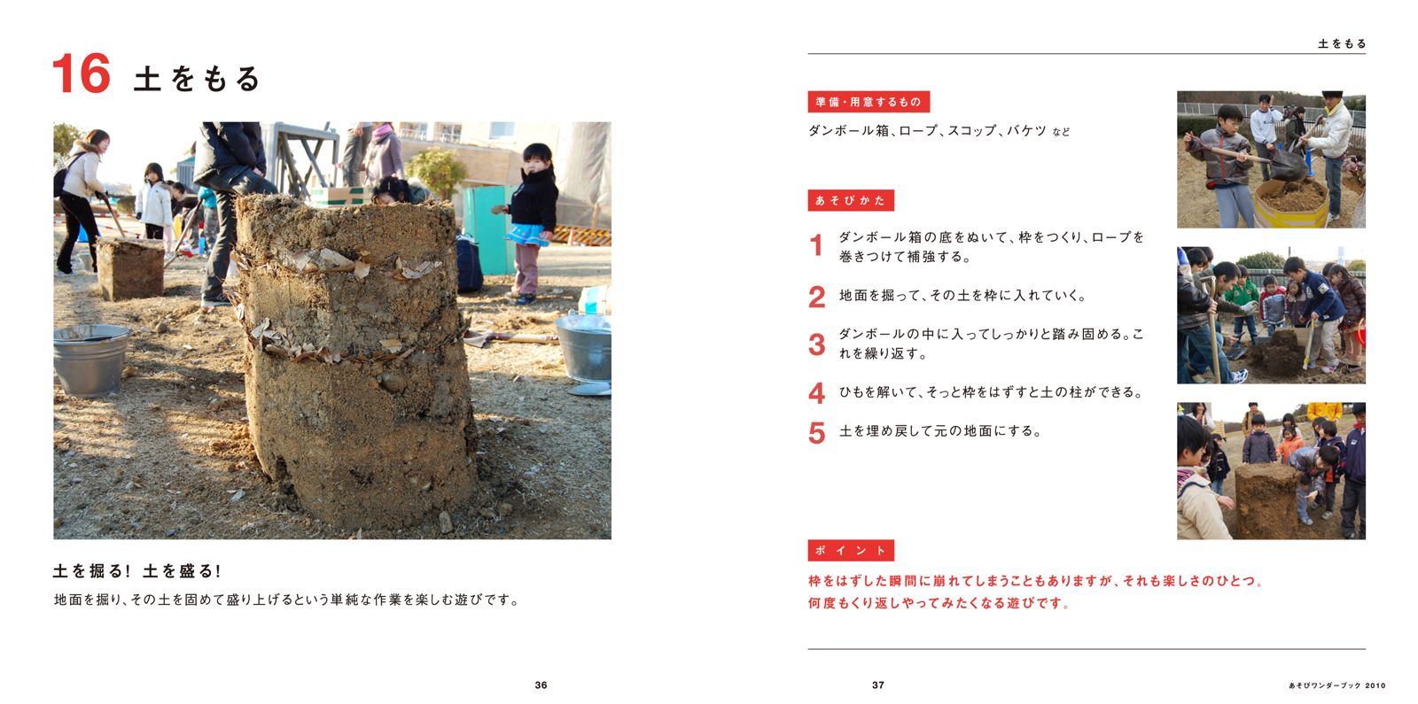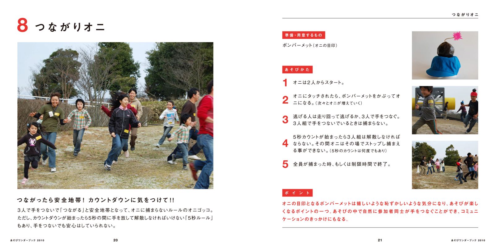 あそびワンダーブック2010 2010年4月4日更新 「あそびワンダーブック2010」は、愛知県児童総合センターで実践してきたたくさんのあそびのプログラムの中から、子どもたちや大人たち、児童館等で遊びにかかわるスタッフの方たちにもういちど紹介したいプログラムを選んで構成しました。 01にぎったカタチ 02ひもでかお 03めプラス 04ウソ絵日記 05ウソのモリ 06ボッチボーリング 07ハリオニ 08つながりオニ 09へんしん大仮面 10テメイシ 11しんぶんしりとり 12太陽のハタ 13クモノス 14つたえよう!「あなたのいいところ」 15土さがし 16土をもる 17こかげプロジェクト 18夜をあるく 19音のカタチ 20うごく!「土のまち」